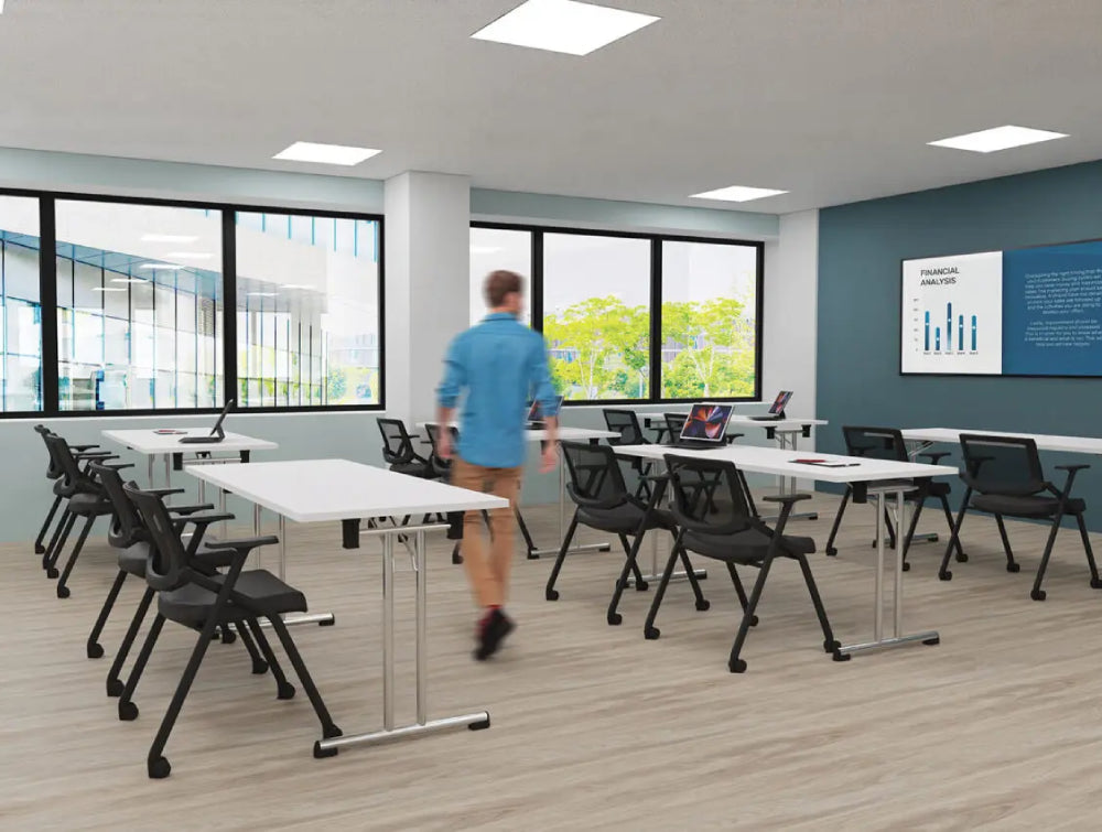 Holding presentations and training sessions requires a classroom-style room. This layout should offer clear visibility for all participants where everyone sits in rows facing forward the screen and the speaker. Mobile, agile furniture can easily reconfigure the space according to the attendees group size.