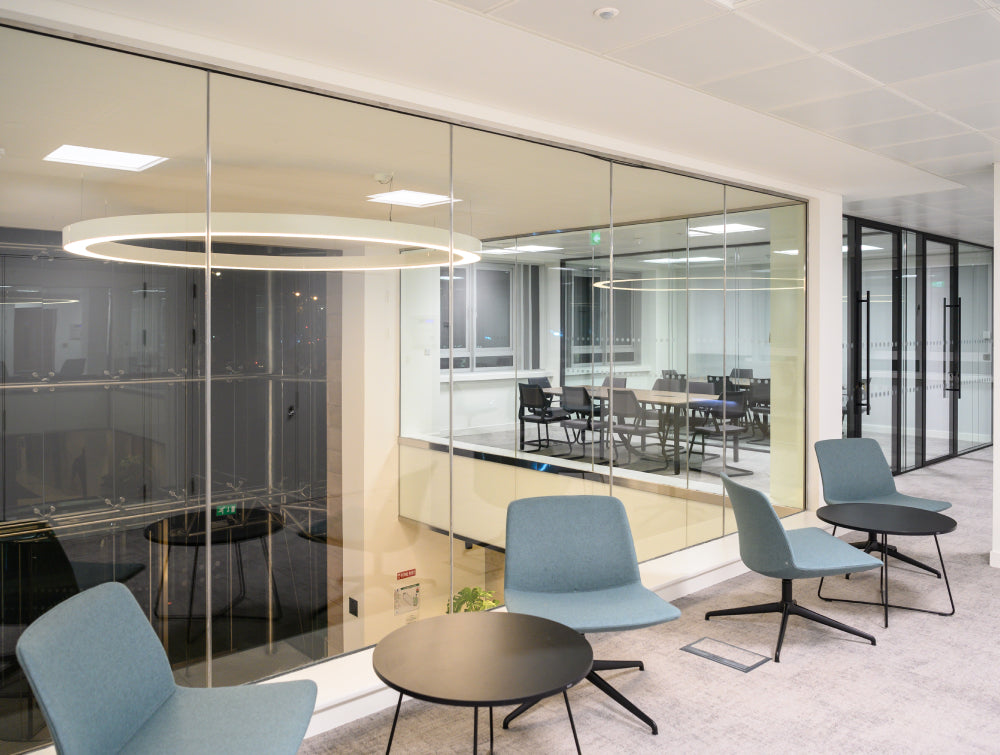 Throughout the interior, a carefully considered material palette of light oak, walnut, and metallic accents is layered with soft blue upholstery, establishing a warm yet contemporary aesthetic. Height-adjustable desks highlight our commitment to ergonomic well-being, while canteens and collaborative nooks encourage a sense of community. Every detail from the reception design to the custom finishes works in harmony to cultivate a flexible, human-focused workspace that feels both refined and approachable.