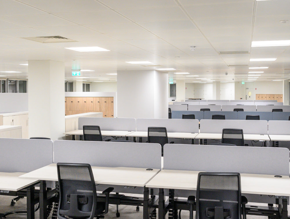 Our latest project for Ardmac was this 1,300-square-metre, two-level office into an environment that balances openness with distinct spatial zones. Each floor features a welcoming reception area, while the open-plan arrangement flows naturally into workstations, executive offices, meeting rooms, and inviting breakout areas. High-row lockers act as both practical storage and a subtle zoning element, maintaining clear sightlines and intuitive circulation paths.