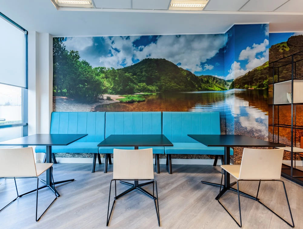 Entering directly into the open plan office it provides a welcoming and bustling feel to the office. The desk pods placed in a crescent formation, orientate you towards glass boards which offer a space for brainstorming and a retreat. Beyond that the canteen brings color and fun with bold tones and a space to relax.