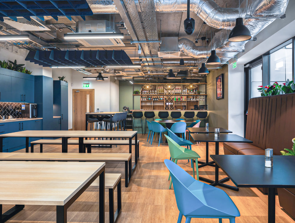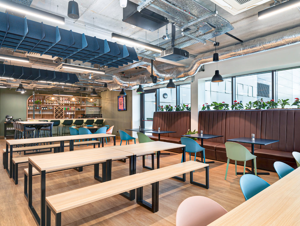 Breakout areas and the canteen introduce controlled color accents – teal, green and rose – on robust surfaces for everyday use. Overhead, EzoBord grid canopies and ceiling baffles support acoustic comfort.
