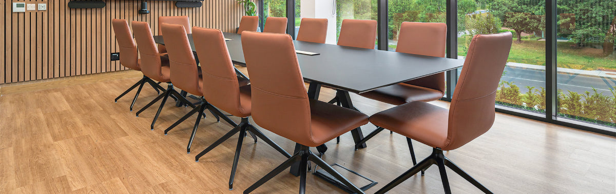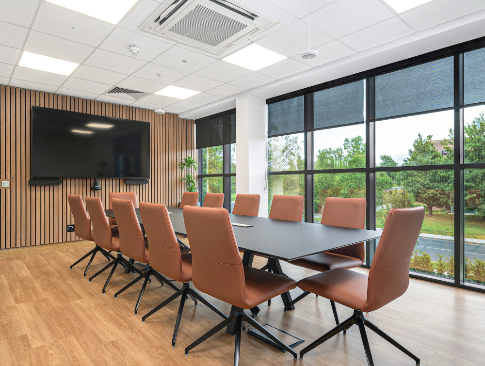 Ergonomics, acoustics and a restrained color palette underpinned the scheme, creating cohesion across multiple levels. Working alongside Module Group as Architect & Designer, Radius Office supplied, delivered and installed the full furniture package. Six open-plan areas were fitted with Workscale.Design bench desks with desk screens and task chairs, finished in Sonoma oak and black with beige textiles and dark navy storage. Meeting rooms are equipped with large, clean-line meeting tables accompanied by seating in cognac eco-leather. A similar color scheme can be seen in the multifunctional room that serves as a conference room but can also be transformed into three separate meeting rooms.