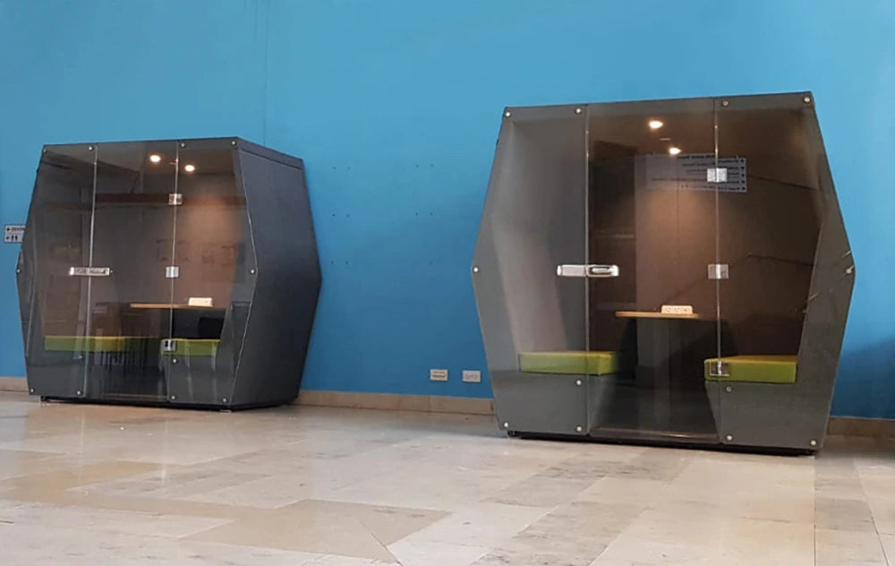 Meet Bill 6-Person Meeting Pod with Glass Front and Back. The Bill collection is an angular range of fully upholstered dens with glass end wall and glass door options. The minimal lines of the collection create both comfort and a focal point for any interior. Bill is a great destination to encourage both collaboration and private work, a glass door adds privacy and quiet in busy offices.