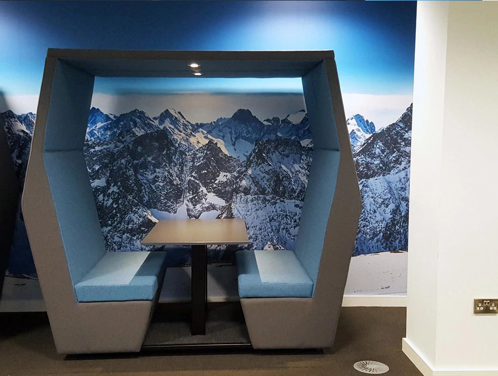 This roofed den meeting pod can be configured in 2, 4 or 6 seats with optional wall, lighting and power supply. Features an acoustic design to reduces noise. Ideal for informal workgroup meetings.