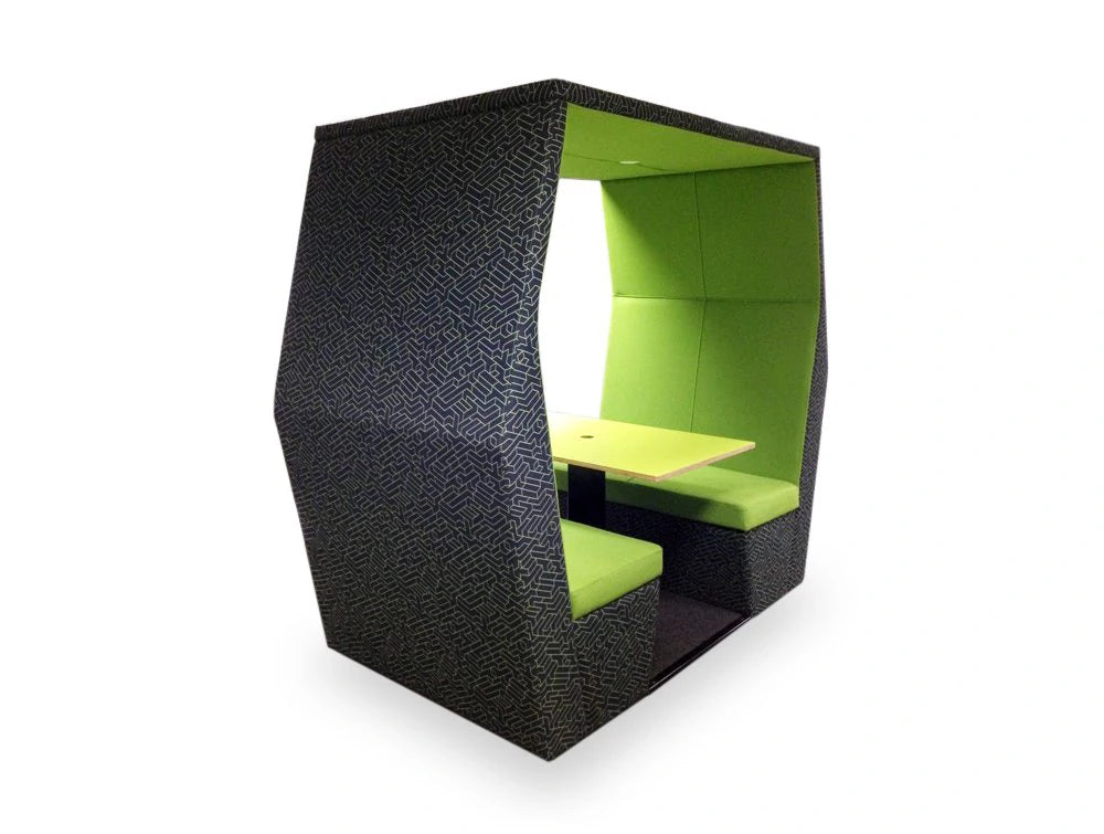 This roofed den meeting pod can be configured in 2, 4 or 6 seats with optional wall, lighting and power supply. Features an acoustic design to reduces noise. Ideal for informal workgroup meetings.
