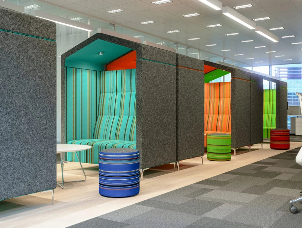 This stylish and highly comfortable 2 seater acoustic meeting pod features high back deep padded foam customisable in an extensive range of fabrics, vinyl & leathers. The meeting pod is equipped with LED lighting.