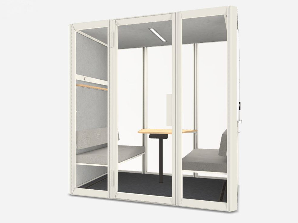 An acoustic oasis for one. Step inside for a quick call, video meeting, or deep work session to come up with the next big idea. Use extra add-on sets for even more functionality. Add bookshelves or a whiteboard anywhere and at any height, inside or out. Your office needs a slight refreshment? Simply reconfigure your add-ons. Its walls can be either black or white, but Jetson is always green at its core. Several innovations make it the most earth-friendly pod on the market.