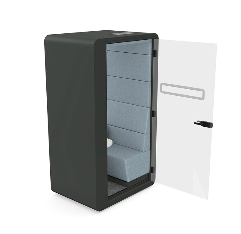 HushHybrid is a solution dedicated to individual work in focus and longer videoconferences, as well as online training and webinars. The cabin has a comfortable, soft seat that helps to maintain an upright body position, and the handle mounted in the product allows you to hang an all-in-one computer or a monitor. Additional side LED strips provide favourable facial illumination during video calls. The depth-adjustable table top on the inside allows you to adjust the depth for your convenience. HushHybrid is characterized by good sound insulation, which provides excellent conditions for performing tasks. The cabin can be ordered with additional stickers on the glass, ensuring privacy, thanks to the "frosting" effect. The combination of these properties creates a universal place for hybrid work, which, in addition to great design, allows you to perform tasks in peace and quiet.