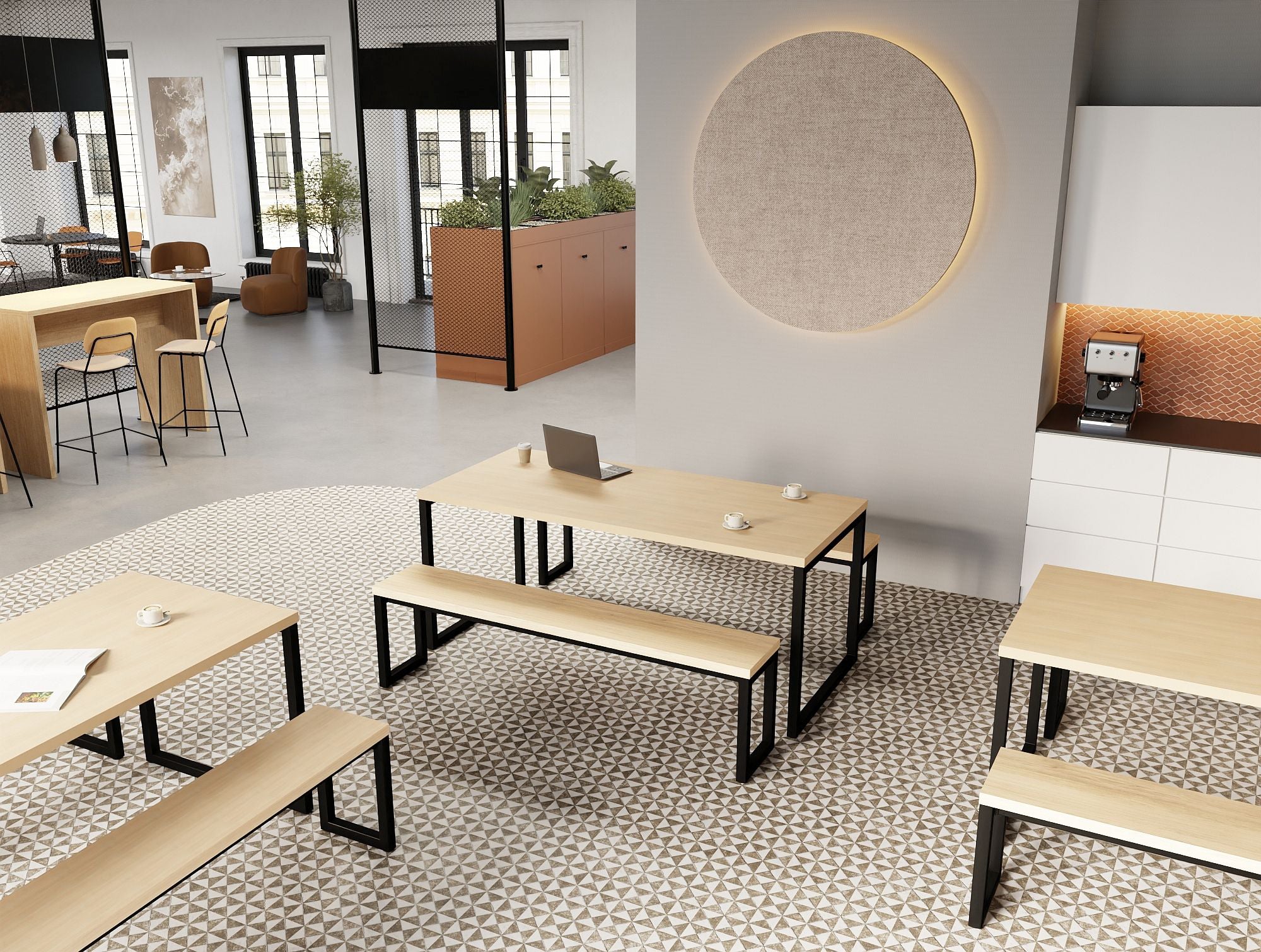 The Nestro collection presents modern canteen tables and bench seating crafted for refined communal and breakout spaces. Featuring a wooden top with metal legs table in a range of widths (1200 - 2000 mm), multiple finishes, and leg styles - from warm wooden slab legs to sleek A-frame, straight or closed metal options - Nestro blends elegance with versatility.